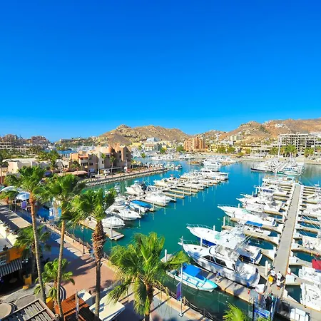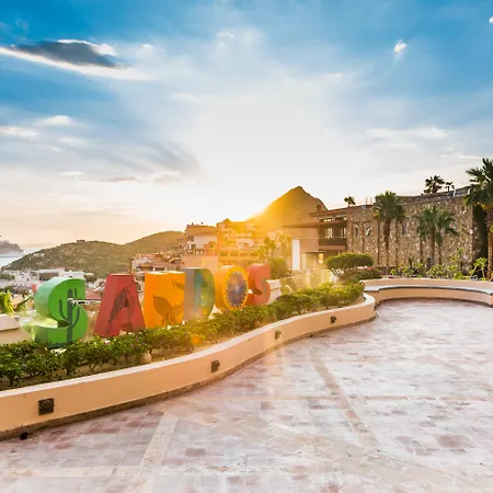 Marina Fiesta Resort offers a prime downtown location, just a short walk from Medano Beach, with picturesque views of the marina. Suites feature traditional Mexican décor, kitchenettes, and balconies overlooking the pool area. The resort includes a full-service spa and a well-equipped gym, providing numerous options for leisure and relaxation. Guests can enjoy a variety of dining experiences, from Italian to seafood, with eight restaurants available. This central location is perfect for those looking to explore local shops and nightlife.